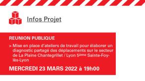La première phase de concertation s’est déroulée entre le 23 mars et le 22 avril 2022, sous la forme de réunion publique, ateliers et, en ligne, sur la plateforme de participation de la Métropole de Lyon : jeparticipe.grandlyon.com. Cette première phase, avait pour objectif principal de construire un diagnostic qui combine les études techniques et les pratiques de déplacement des usagers du secteur, tous modes confondus.