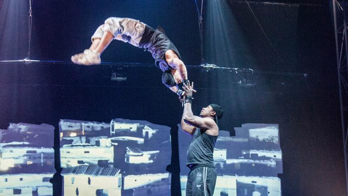 Mené tambour battant par des artistes ultra musclés, hommes et femmes, ce show nous gratifie de numéros époustouflants, où la vie du barrio se raconte en toutes sortes de confrontations acrobatiques à couper le souffle. Non seulement ces jeunes Colombiens sont rompus à tous les agrès circassiens, défiant avec insolence les lois de la gravité, mais ils trouvent encore une incroyable énergie pour chanter et rapper en live sur un gros son original, 100% hip hop et reggaeton. Un rythme effréné pour un show virtuose. On en sort indemne, mais heureux.