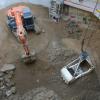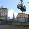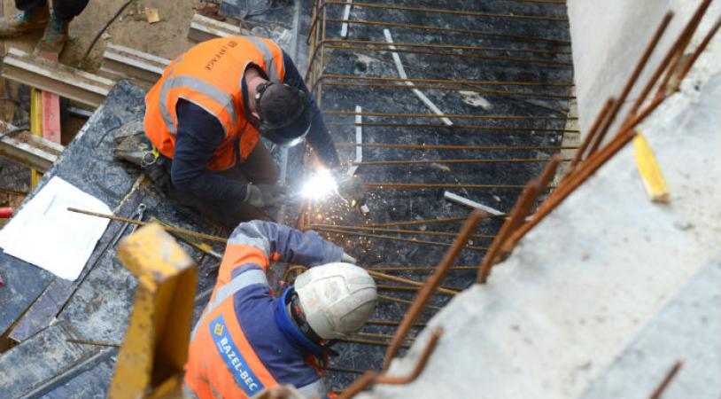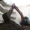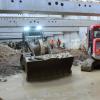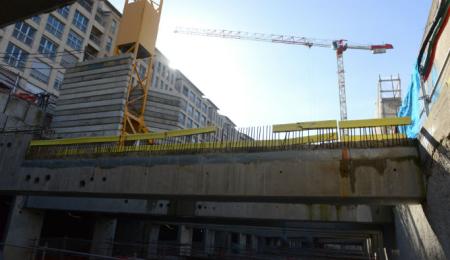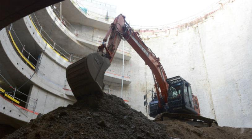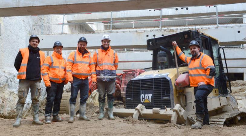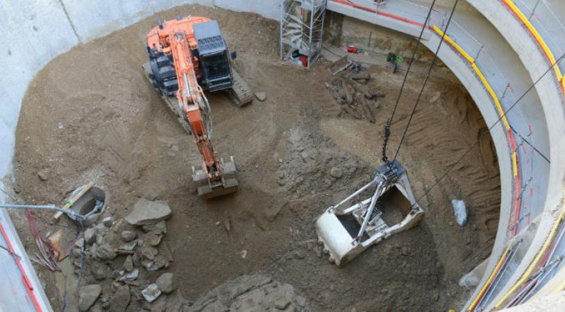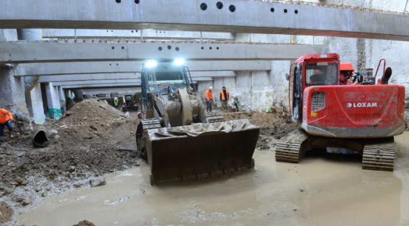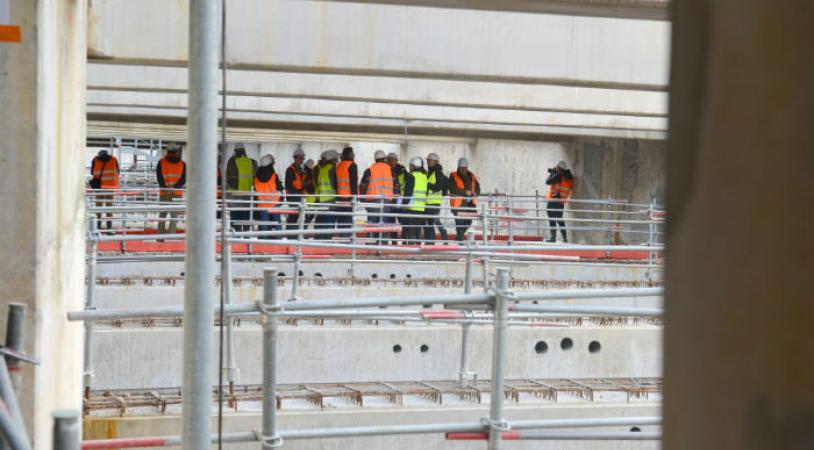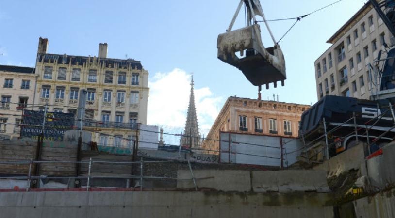 L’heure est à l’achèvement du terrassement du dernier niveau du parc, c’est-à-dire le - 5. Une cinquantaine d’ouvriers sont sur le pont. Ici, soit 12 mètres en-dessous du fond de la Saône, les engins s’activent d’un côté pour décaisser le sol tandis que de l'autre des ouvriers posent l’armature métallique de la future dalle.