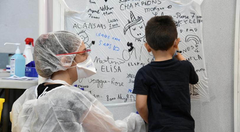 Au lendemain des annonces de nouvelles mesures de restriction et en cette veille de week-end de Pâques, « nous recevons un peu plus de monde », déclare une infirmière. Sur la paroi du box où le test de dépistage est pratiqué, le regard est attiré sur une blouse blanche exposée couverte de prénoms et âges d’enfants : Nathan, 11 ans, Lalya-Rose, 7 ans, Ayoub, 10 ans, Julie, 4 ans et demi... « C’est le tablier des super champions », précisent les infirmières, « après avoir fait le test à un enfant, on lui demande de signer car c’est un super héros. Cela dédramatise en lui permettant de penser à autre chose. »