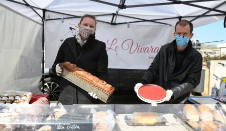 En ce samedi matin ensoleillé mais venté, Vanessa, responsable commerciale, et Alexandre, serveur, tiennent le stand du Vivarais. « Nous sommes présents au marché depuis le début de l’opération. Nous avons fait la demande dès son lancement car nous sommes toujours ouverts aux nouvelles idées », déclare Vanessa. Elle précise : « Nous maintenons une activité au restaurant avec la vente à emporter le midi. Nous proposons des plats du jour. Actuellement, notre clientèle est composée d’habitués et de personnes qui travaillent dans le quartier qui n’ont pas envie de se faire à manger. » Au marché, pas de plat à emporter mais du pâté en croûte Richelieu, des quiches, des saucissons briochés, des tartes et brioches aux pralines… évidemment faits maison. « Ici, nous apportons des produits faciles à emporter pour les clients. D’autant que nous n’avons pas beaucoup de matériel. »