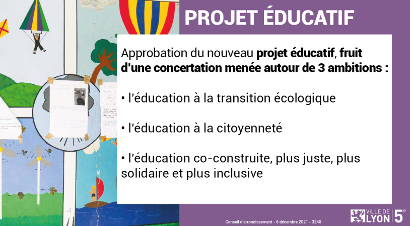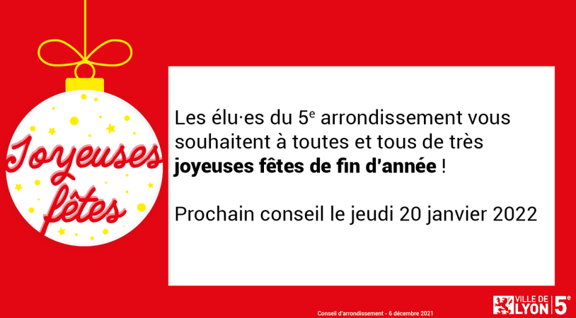 Le Conseil d'arrondissement du 6 décembre se déroule à la Mairie annexe du Vieux Lyon à partir de 18h30 et est retransmis en direct sur Youtube. Il est précédé à 18h d'une restitution du diagnostic de territoire seniors.