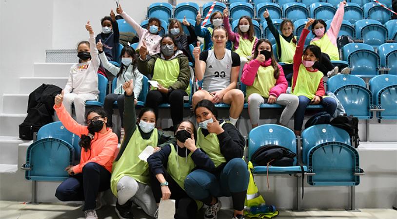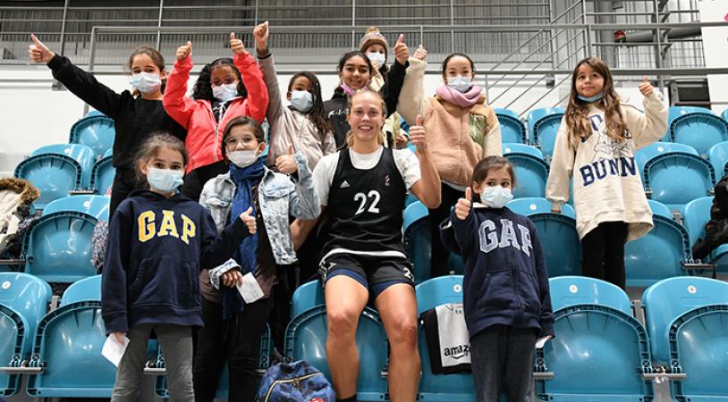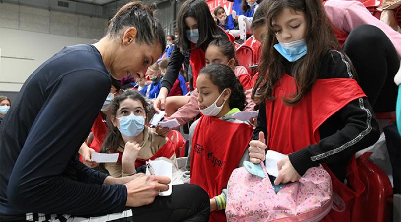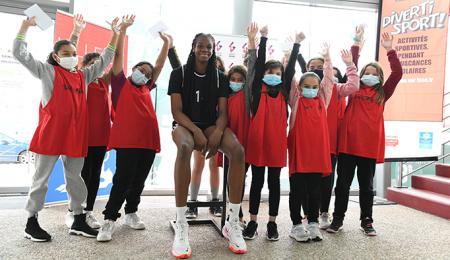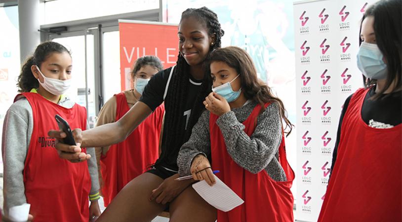 Durant cette journée dédiée entièrement au sport féminin organisée par le Service Animation Sportive de la Direction des Sports de la Ville de Lyon, les filles ont pu assister aux entraînements des joueuses professionnelles du LDLC ASVEL FEMININ. Elles ont pu également interviewer quelques unes d’entre elles dont Dominique Malonga, 15 ans, la toute jeune et nouvelle lionne de l’équipe. A l’issue de l’entraînement les joueuses ce sont volontiers prêtées au jeu des autographes, photos et selfies !