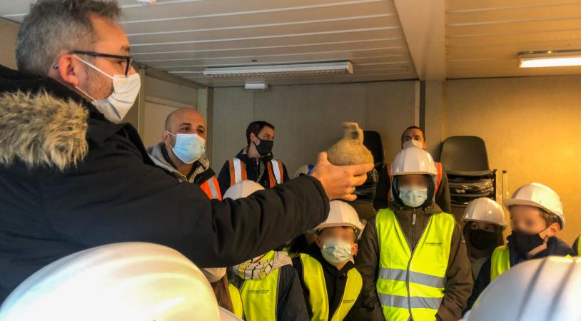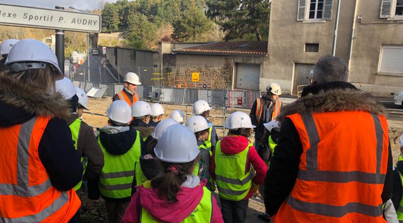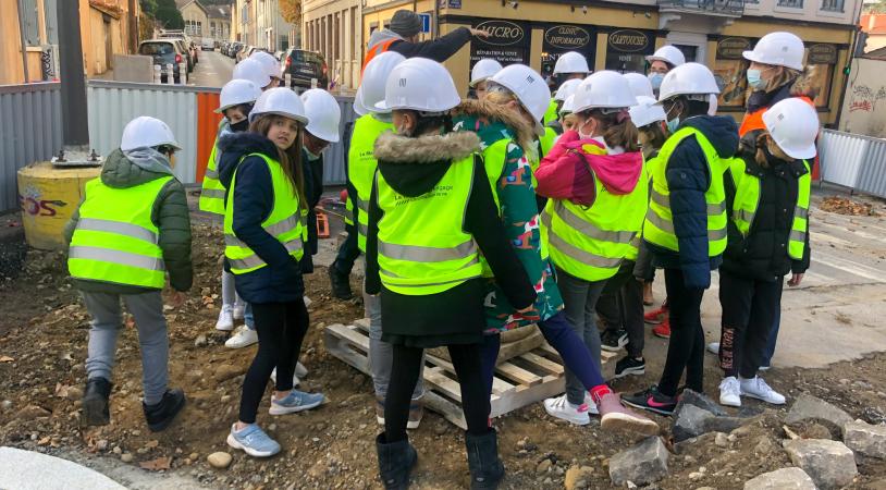 Le 18 novembre 2021, les élèves de l’école Ferdinand Buisson ont pu découvrir les sondages archéologiques réalisés sur le chantier de la rue Pierre Audry aux côtés de Marielle Perrin, conseillère du 5e arrondissement déléguée aux Mobilités et à la Voirie, les équipes du Grand Lyon et le service archéologique de la Ville de Lyon !