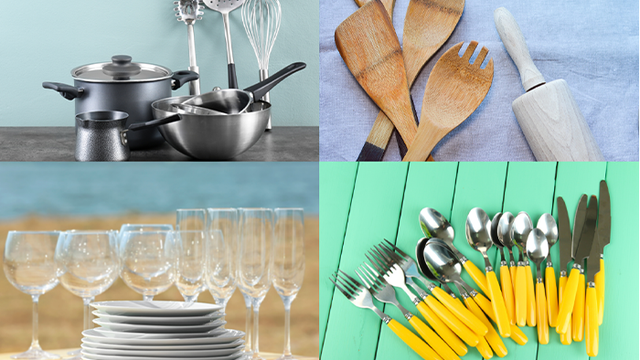 Casseroles, poêles, assiettes, couverts, verres, tasses, bols et encore d'autres ustensiles de cuisine en bon état seront les bienvenus.