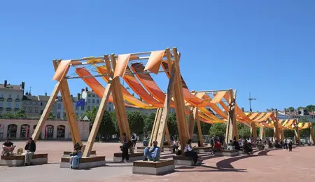 À l’issue d’une procédure de marché public, la Ville de Lyon a donc retenu le projet Tissage urbain présenté par le groupement constitué de l’artiste Romain Froquet, le cabinet Tristan Architecture et AIA Life Designers. Objectif : transformer cet espace public ouvert et minéral en une place accueillante tout au long de l’année, et principalement pendant la période estivale où les températures sont de plus en plus élevées. Avec comme consigne : que l'installation s'intègre et respecte les éléments historiques emblématiques de la place Bellecour. Ainsi l’oeuvre Tissage urbain s'inspire des canuts, tisserands de soie lyonnais. Ses structures bois et les drapés suspendus évoquent les métiers à tisser célébrant l'identité de la ville et le patrimoine culturel de Lyon.