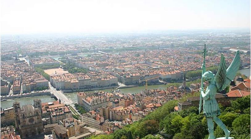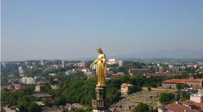 En 1643, la ville se place sous la protection de la Vierge, puis à la suite d'un voeu, la Basilique de Fourvière, oeuvre de Pierre Bossan, fut construite et inaugurée en 1896. Sa silhouette étrange et massive flanquée de 4 tours octogonales domine la ville. Au pied de la Basilique, l'esplanade offre une vue panoramique de Lyon.