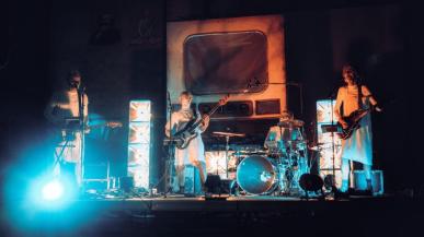 Sur scène, les musiciens revisitent des hymnes disco devant une télévision géante dont ils semblent sortir.